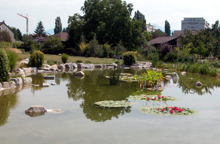 2. Des nénuphars et des lotus y fleurissent pendant la belle saison et des libellules de toutes les couleurs paradent sur les eaux. Le pourtour de l'étang est composé d'une végétation méditerranéenne donnant des airs de vacances dans un endroit des plus bucoliques. Une place de jeux, quelques arbres fruitiers d'anciennes variétés et un espace engazonné complètent agréablement cet aménagement qui offre un dégagement sur les montagnes savoyardes.